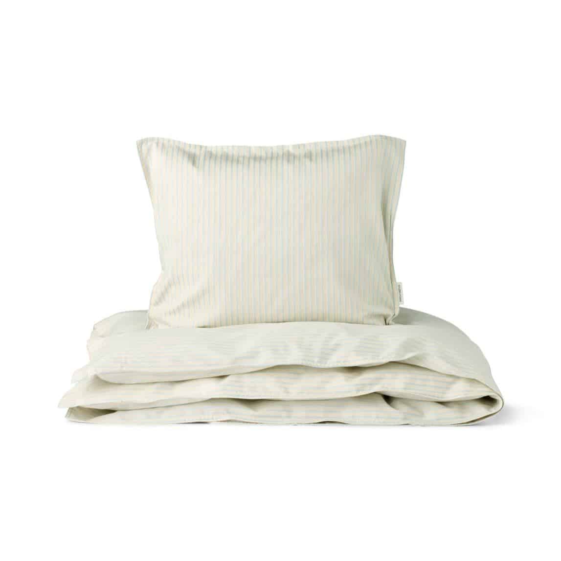 Dette stribet sengesæt fra Studio Feder er designet i cremefarvet med lyseblå striber. Sengesættet lukkes med knaplukning og kommer med en lille stofpose i matchende stof.